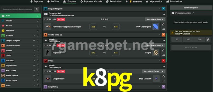 O k8pg oferece uma grande seleção de opções de apostas em e-sports com probabilidades competitivas